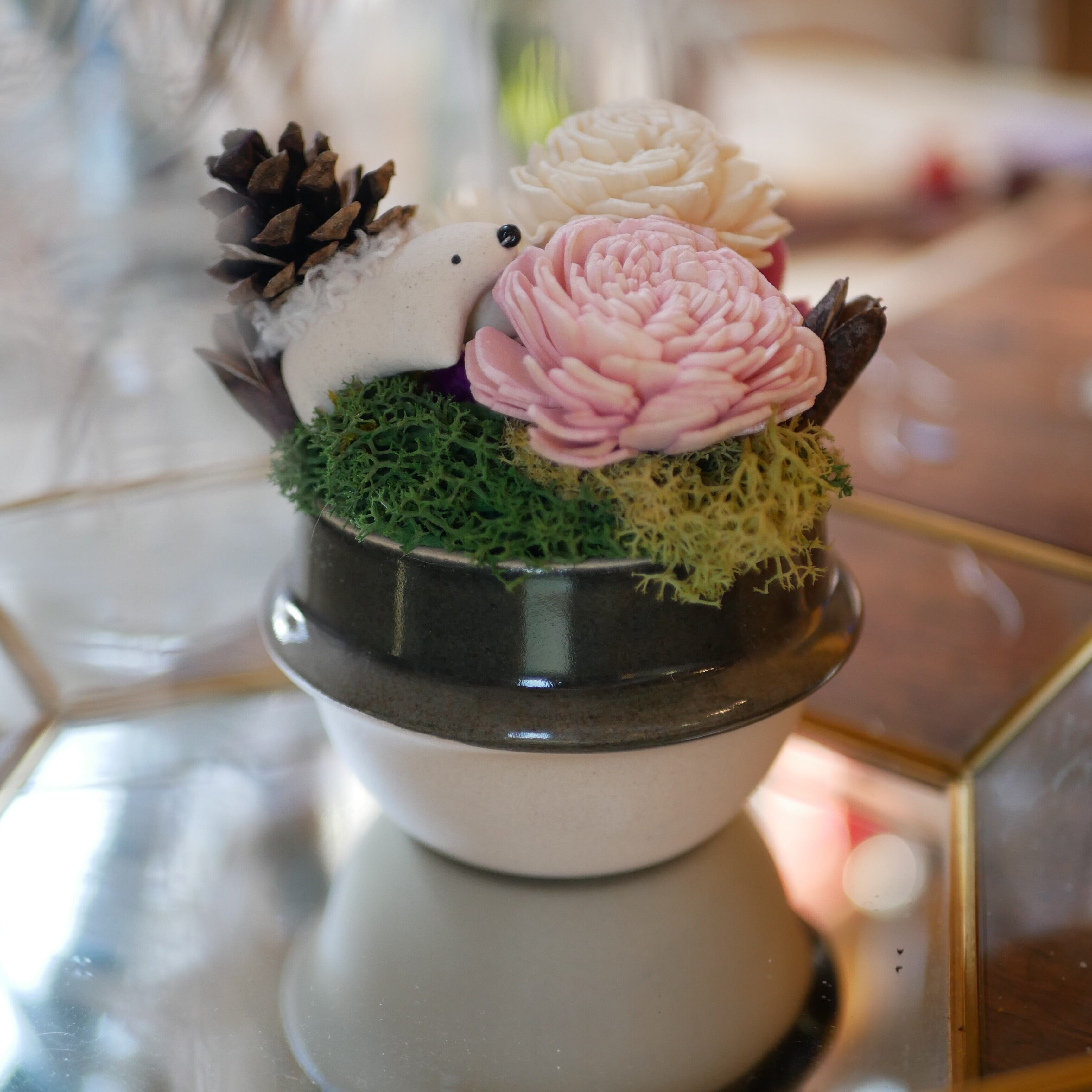 益子焼つかもとミニ釜、ソラフラワー、プリザーブドフラワー、モス、ハリボックリなど