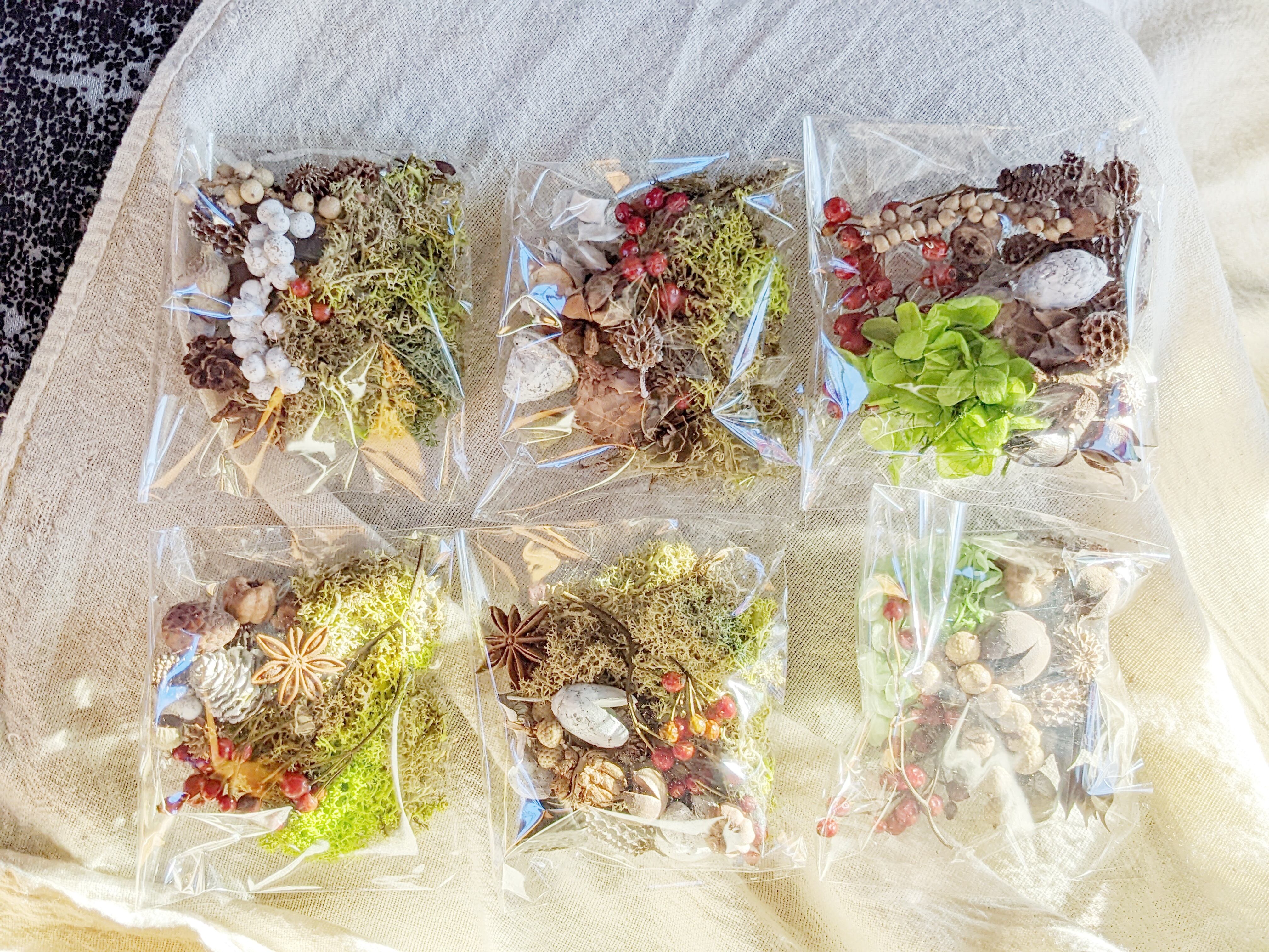 まつぼっくりと粘土などで1つ1つ丁寧にお作りしています。